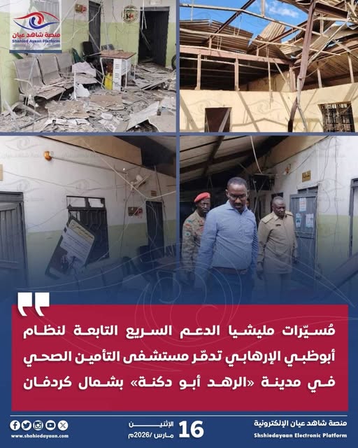 مُسيّرات مليشيا الدعم السريع التابعة لنظام أبوظبي الإرهابي تدمّر مستشفى التأمين الصحي في مدينة «الرهد أبو دكنة» بشمال كردفان قصفت…