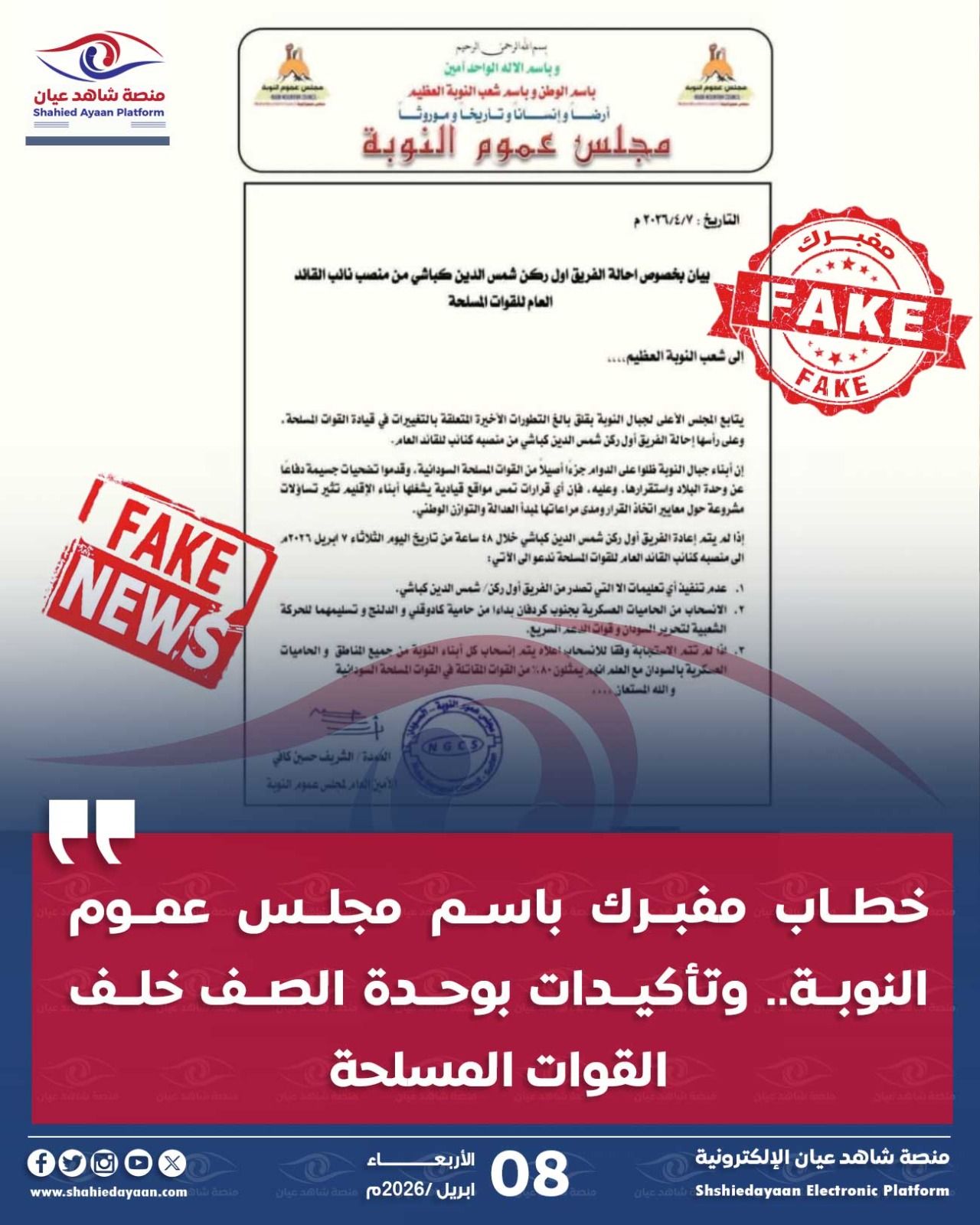 أكد عضو في تنسيقية أبناء النوبة لـ “منصة شاهد عيان” عدم صحة الخطاب المتداول والمنسوب إلى مجلس عموم النوبة، واصفاً…