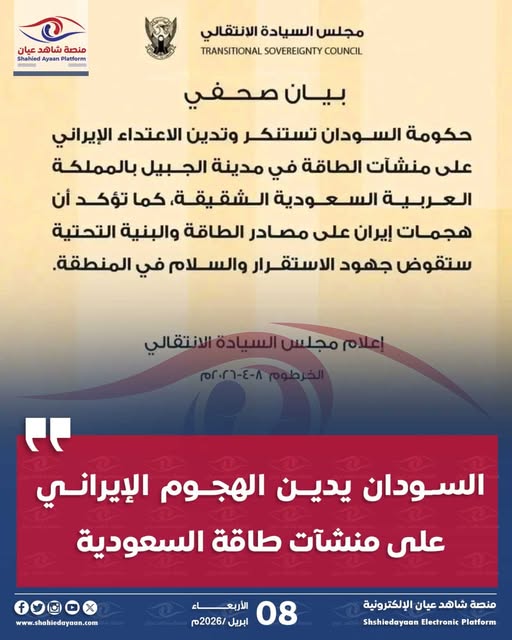 الخرطوم – ٨ أبريل ٢٠٢٦م أعرب السودان عن إدانته واستنكاره الشديدين للهجوم الذي نُسب إلى إيران واستهدف منشآت للطاقة في…