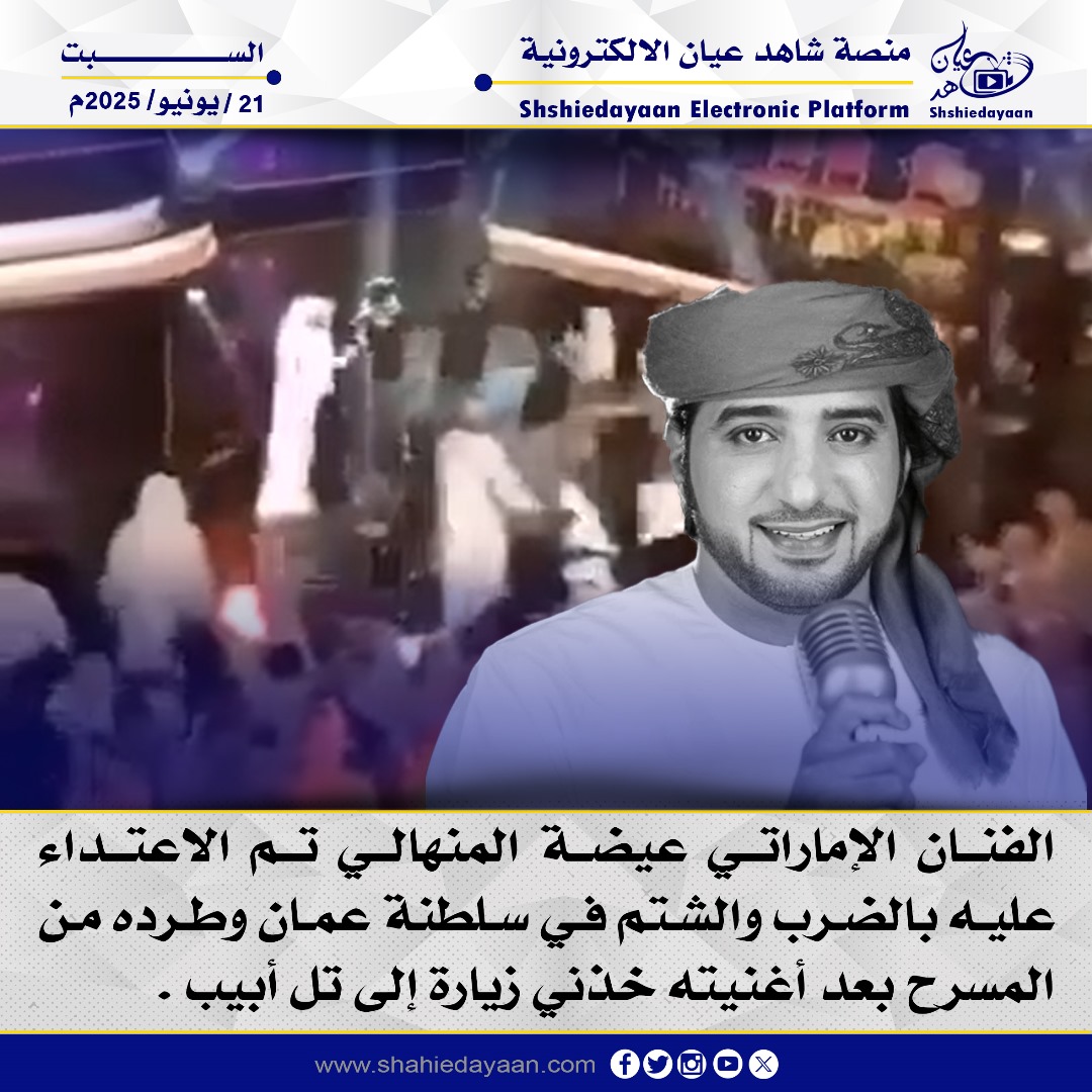 الفنان الإماراتي عيضة المنهالي تم الاعتداء عليه بالضرب والشتم في سلطنة عمان وطرده من المسرح بعد أغنيته خذني زيارة إلى تل أبيب .