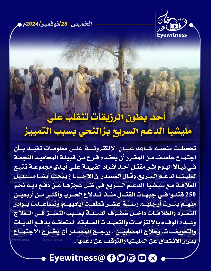 خبر في صورة أحد بطون الرزيقات تنقلب علي مليشيا الدعم السريع بز النحي بسبب التمييز شاهد عيان نوفمبر 28, 2024 0