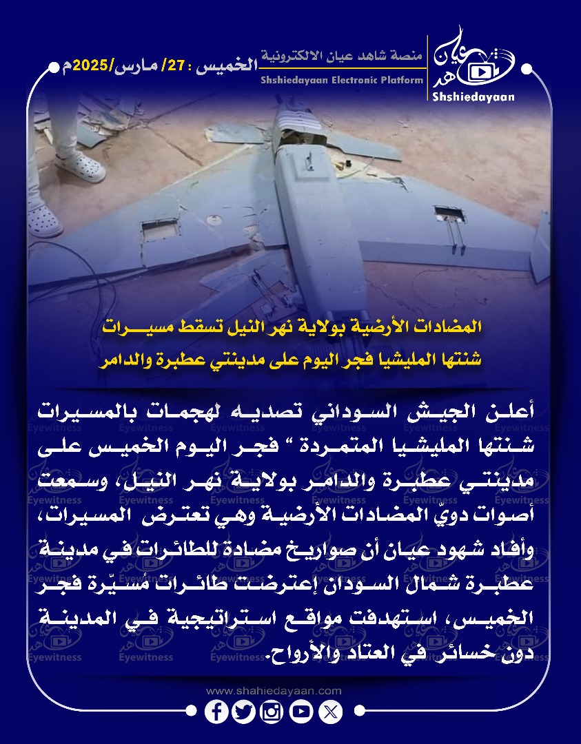 المضادات الأرضية بولاية نهر النيل تسقط مسيرات شنتها المليشيا فجر اليوم على مدينتي عطبرة والدامر