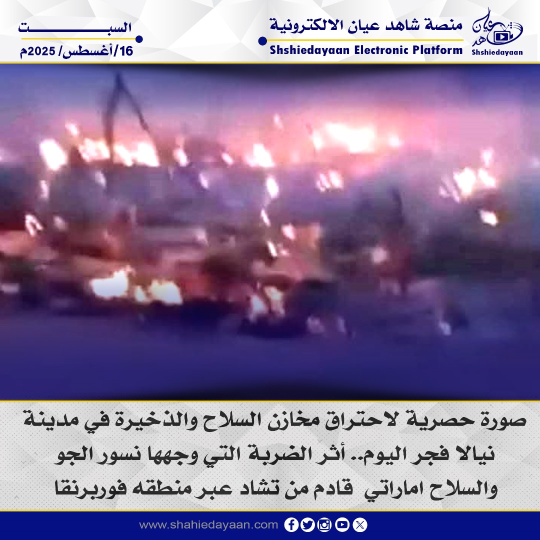صورة حصرية لاحتراق مخازن السلاح والذخيرة في مدينة نيالا فجر اليوم.. أثر الضربة التي وجهها نسور الجو والسلاح اماراتي قادم من تشاد عبر منطقه فوربرنقا