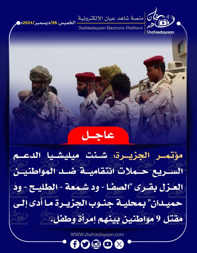 الأخبار خبر في صورة عاجل….. مؤتمر الجزيرة شنت ميليشيا الدعم السريع حملات انتقامية ضد المواطنين العزل شاهد عيان ديسمبر 5, 2024 0