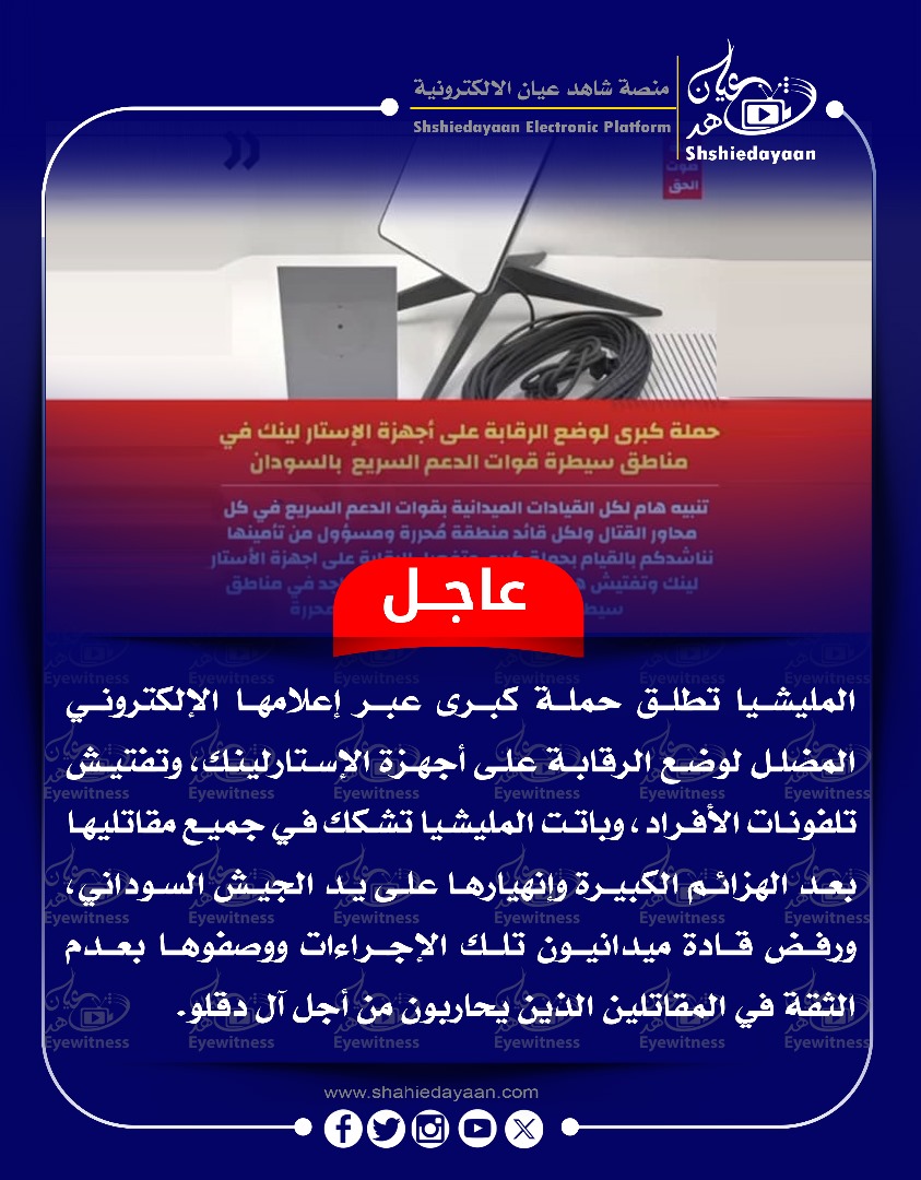 الرئيسية|خبر في صورة|عاجل خبر في صورة عاجل المليشيا تطلق حملة كبرى عبر إعلامها الإلكتروني المضلل لوضع الرقابة على أجهزة الإستارلينك، وتفتيش تلفونات الأفراد شاهد عيان تابع على X فبراير 16, 20250 0 أقل من دقيقة نسخ الرابط تم نسخ الرابط شاهد عيان تابع على X فبراير 16, 20250 0 أقل من دقيقة فيسبوك X ماسنجر ماسنجر واتساب تيلقرام مشاركة عبر البريد طباعة
