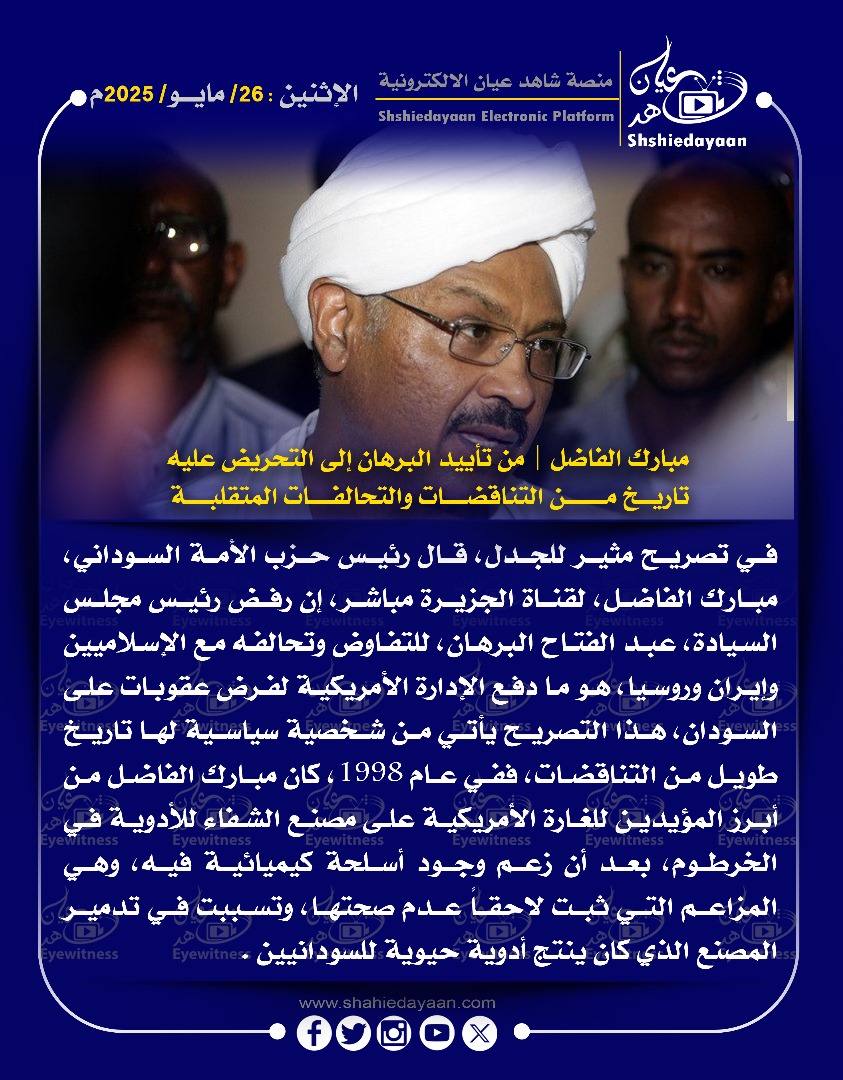 الرئيسية|خبر في صورة|الأخبار|مبارك الفاضل | من تأييد البرهان إلى التحريض عليه تاريخ من التناقضات والتحالفات المتقلبة الأخبارخبر في صورة مبارك الفاضل | من تأييد البرهان إلى التحريض عليه تاريخ من التناقضات والتحالفات المتقلبة شاهد عيان تابع على X مايو 26, 20250 1 أقل من دقيقة نسخ الرابط تم نسخ الرابط شاهد عيان تابع على X مايو 26, 20250 1 أقل من دقيقة فيسبوك X ماسنجر ماسنجر واتساب تيلقرام مشاركة عبر البريد طباعة