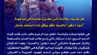 اسرعوا بتسليح الشعب وتحركوا عسكريا ثم دبلوماسيا من خلال مجلس الأمن لوقف الإمداد من الإمارات عبر تشاد وليبيا. لا مجال لتأخير أو تردد..