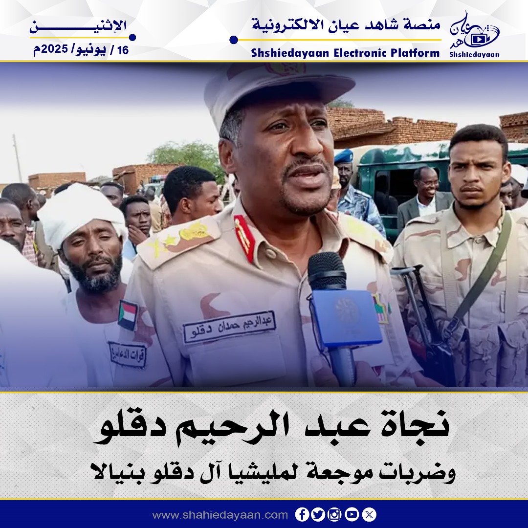 كشفت مصادر عسكرية مطلعة عن نجاة عبد الرحيم دقلو، القائد الثاني لمليشيا آل دقلو من محاولة استهداف مباشرة بطائرة مسيّرة تابعة للجيش السوداني، أثناء حضوره حفل تأبين في حي الرحمن بمدينة نيالا، عاصمة ولاية جنوب دارفور.