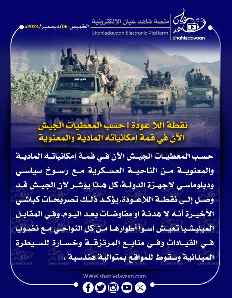 الأخبار خبر في صورة نقطة اللا عودة حسب المعطيات الجيش الآن في قمة إمكانياته المادية والمعنوية حسب المعطيات الجيش الآن في قمة إمكانياته المادية والمعنوية شاهد عيان ديسمبر 5, 2024 0