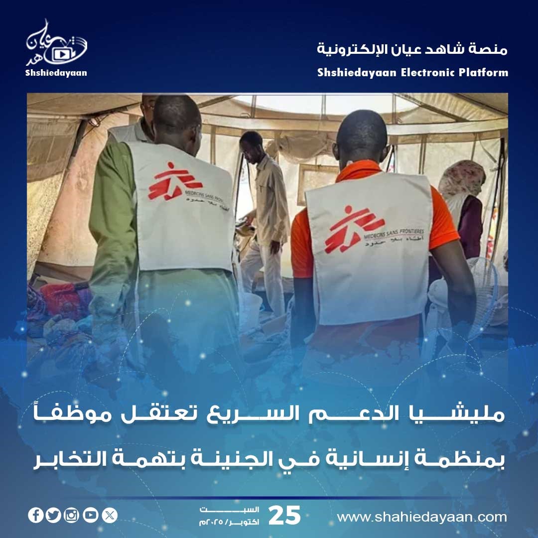 اعتقلت مليشيا الدعم السريع بمدينة الجنينة موظفًا سودانيًا يعمل لدى منظمة “أطباء بلا حدود” الإسبانية، بتهمة التخابر مع الجيش السوداني، وفقًا لمصادر محلية. المليشيا داهمت مقر إقامة الموظف وصادرت هاتفه وأوراقه دون إخطار رسمي للمنظمة، في ثاني حادثة من نوعها خلال أسابيع، وسط تصاعد الانتهاكات ضد منظمات إنسانية في مناطق سيطرتها. وتستهدف الحملة موظفين وناشطين مدنيين يُشتبه بتواصلهم مع الجيش، في ظل تصاعد التوترات العسكرية بدارفور. مراقبون دعوا الحكومة والمنظمات الدولية للتدخل العاجل وضمان حرية العمل الإنساني وفق القانون الدولي.