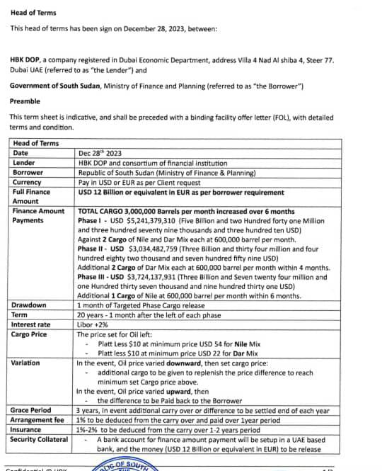 في يوم الخميس 28 ديسمبر 2023 بمدينة (دبي) بدولة الامارات تم التوقيع و الموافقة من حكومة جنوب السودان علي شروط الصفقة الاماراتية لشراء نفط جنوب السودان مقدما مقابل 12 مليار دولار لمدة 20 عام في صفقة تم وصفها بانها (قرض) مالي اماراتي لحكومة جنوب السودان ولكنها في الحقيقة صفقة بيع و شراء لنفط جنوب السودان مقدما بشروط اماراتيه
