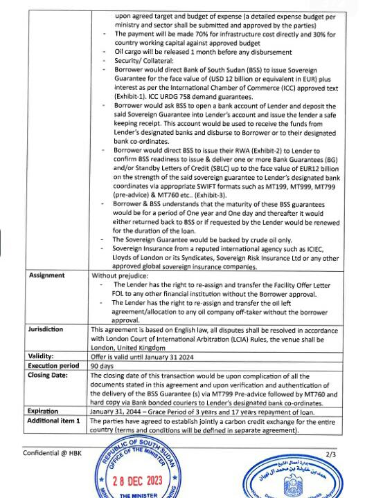 و اشترط الجانب الاماراتي علي حكومة جنوب السودان دعم الضمان السي ادي المقدم من حكومة جنوب السودان بالنفط فقط و ان يكون تامين الضمان السيادي من وكالة دوليه واقترح الجانب الاماراتي شركة (LIoyds of london) او شركة تامين عالمية و بموجب العقد يحق للامارات اعادة بيع حصتها في الاتفاق مع حكومة جنوب السودان لاي جهة دون الحاجة لموافقة حكومة جنوب السودان وبموجب بند اضافي في العقد سوف تقوم شركة HBK بتمويل بناء خط انابيب و مصفاة وقع العقد حسب الشروط الاماراتيه من جانب حكومة جنوب السودان (د.باك برنابا) و من الجانب الاماراتي (حمد النهيان) / تم التوقيع تحت عنوان (مقبول و متفق عليه) تاريخ نهاية العقد مع حكومة جنوب السودان 31 يناير 204