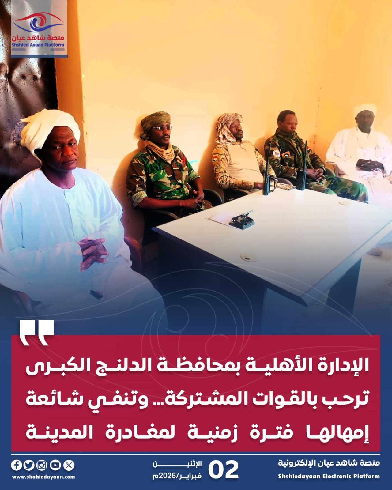 الإدارة الأهلية بمحافظة الدلنج الكبرى ترحب بالقوات المشتركة… وتنفي شائعة إمهالها فترة زمنية لمغادرة المدينة الإدارة الأهلية بالدلنج الكبرى ترحب…