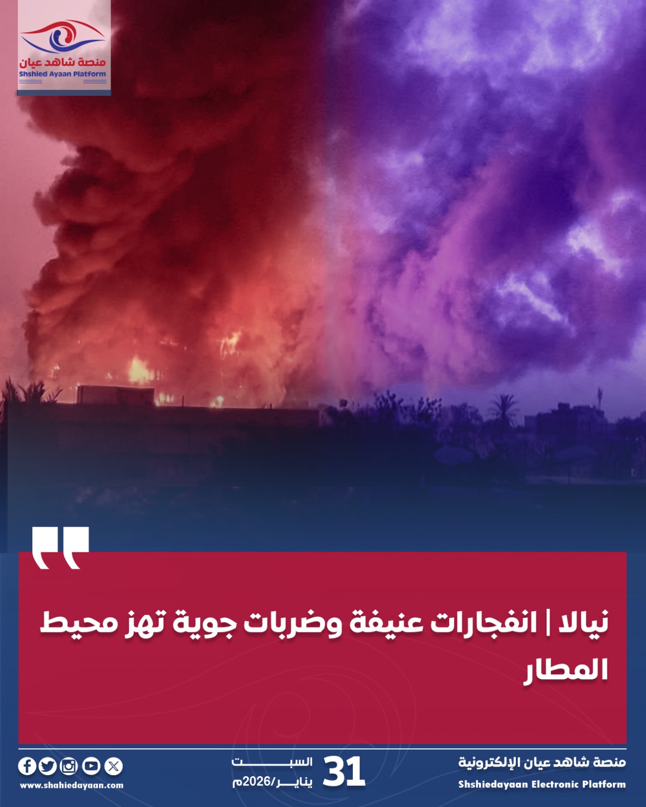 نيالا | انفجارات عنيفة وضربات جوية تهز محيط المطار هزّت أصوات انفجارات قوية، مساء اليوم، أحياء واسعة من مدينة نيالا،…