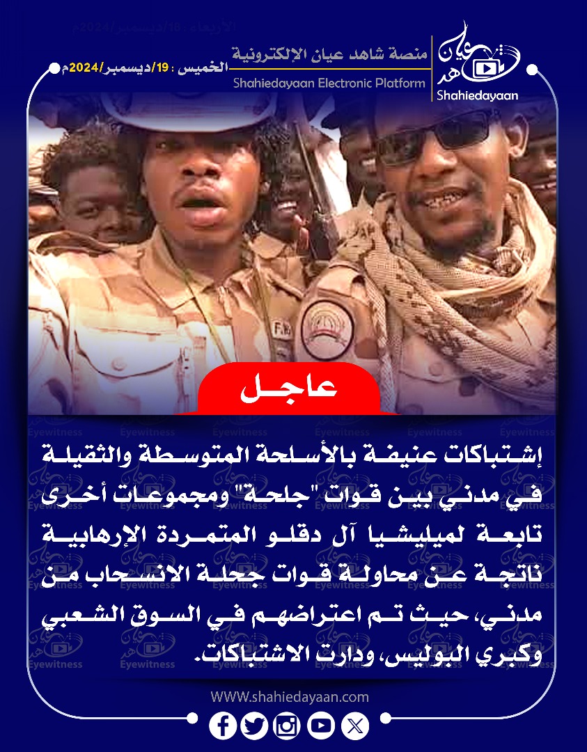 خبر في صورة الأخبار إشتباكات عنيفة بالأسلحة المتوسطة والثقيلة في مدني بين قوات “جلحة” شاهد عيان ديسمبر 19, 2024 0 أقرأ المزيد ..