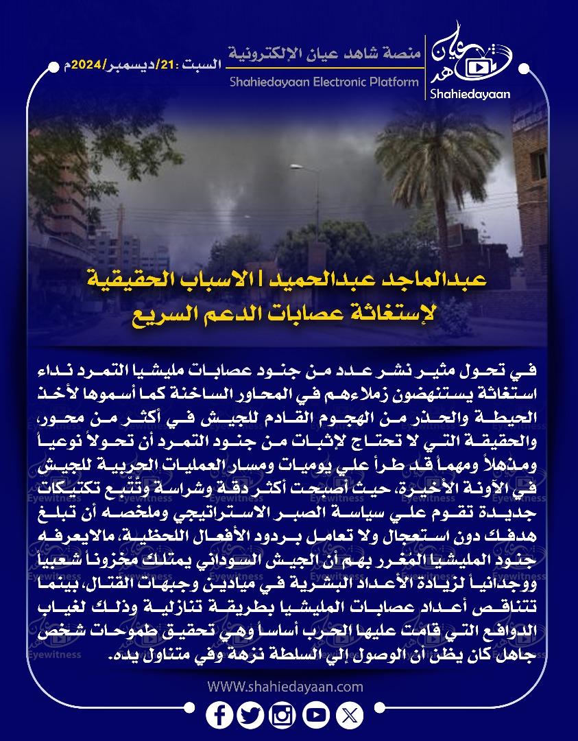 خبر في صورة الأخبار عبد الماجد عبد الحميد | الاسباب الحقيقية الإستغاثة عصابات الدعم السريع شاهد عيان ديسمبر 21, 2024 0 أقرأ المزيد ..