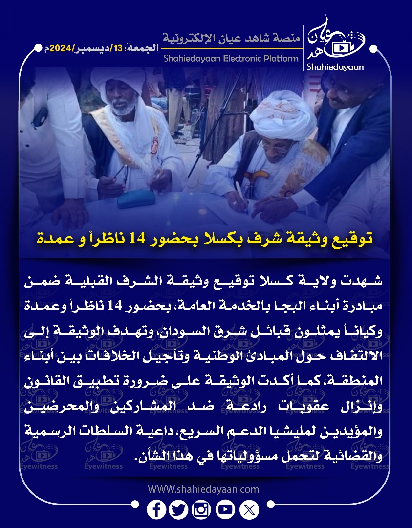 خبر في صورة الأخبار توقيع وثيقة شرف بكسلا بحضور 14 ناظراً وعمدة شاهد عيان ديسمبر 13, 2024 0 أقرأ المزيد ..