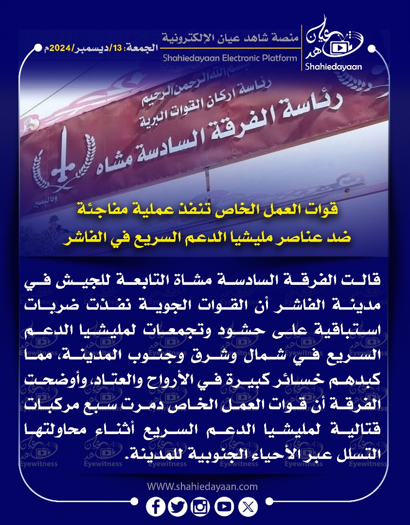 خبر في صورة الأخبار قوات العمل الخاص تنفذ عملية مفاجئة ضد عناصر مليشيا الدعم السريع في الفاشر شاهد عيان ديسمبر 13, 2024 0 أقرأ المزيد ..