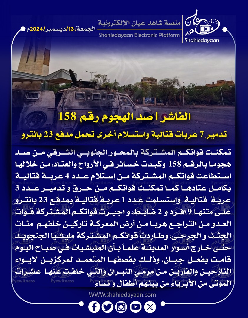خبر في صورة الأخبار الفاشر | صد الهجوم رقم 158 تدمير 7 عربات قتالية واستسلام أخرى تحمل مدفع 23 بانترو شاهد عيان ديسمبر 13, 2024 0 أقرأ المزيد ..