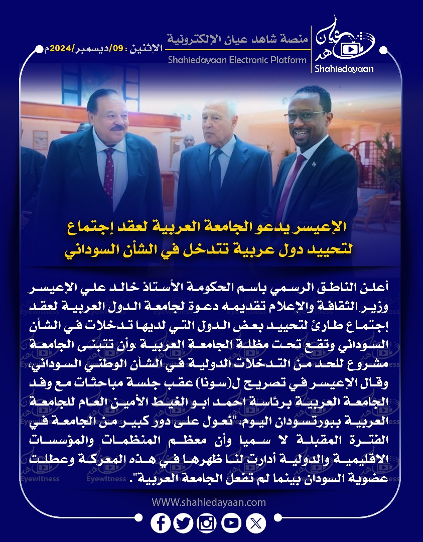 الأخبار خبر في صورة الإعيسر يدعو الجامعة العربية لعقد إجتماع لتحييد دول عربية تتدخل في الشأن السوداني شاهد عيان ديسمبر 9, 2024 0 أقرأ المزيد ..