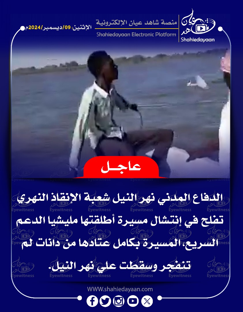 الأخبار خبر في صورة عاجل…..الدفاع المدني نهر النيل شعبة الإنقاذ النهري تفلح في إنتشال مسيرة أطلقتها مليشيا الدعم السريع شاهد عيان ديسمبر 9, 2024 0 أقرأ المزيد ..