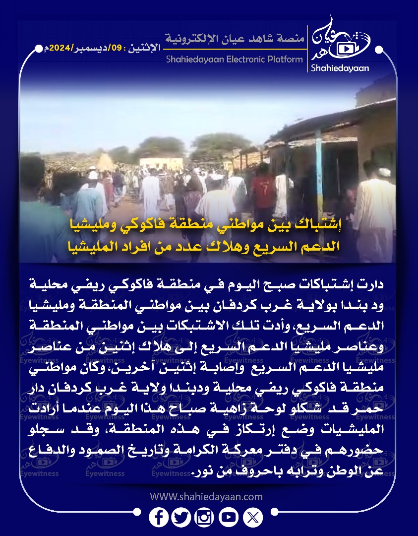 الأخبار خبر في صورة إشتباك بين مواطني منطقة فاكوكي ومليشيا الدعم السريع وهلاك عدد من افراد المليشيا شاهد عيان ديسمبر 9, 2024 0 أقرأ المزيد ..