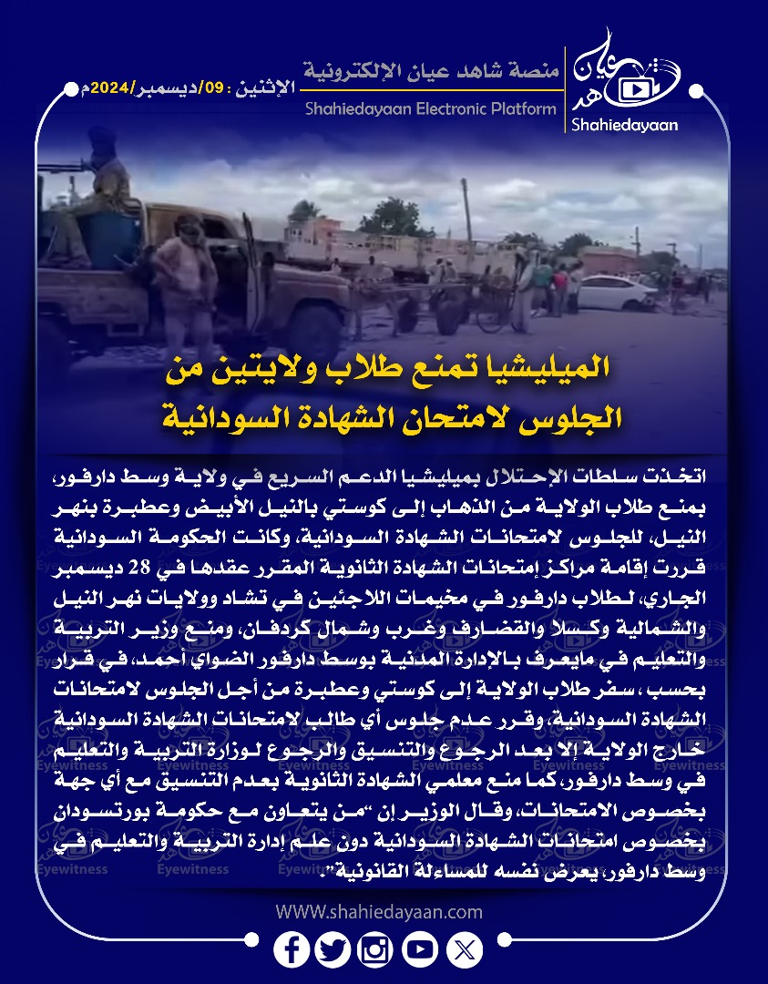 الأخبار خبر في صورة الميليشيا تمنع طلاب ولايتين من الجلوس لامتحان الشهادة السودانية شاهد عيان ديسمبر 9, 2024 0 أقرأ المزيد ..