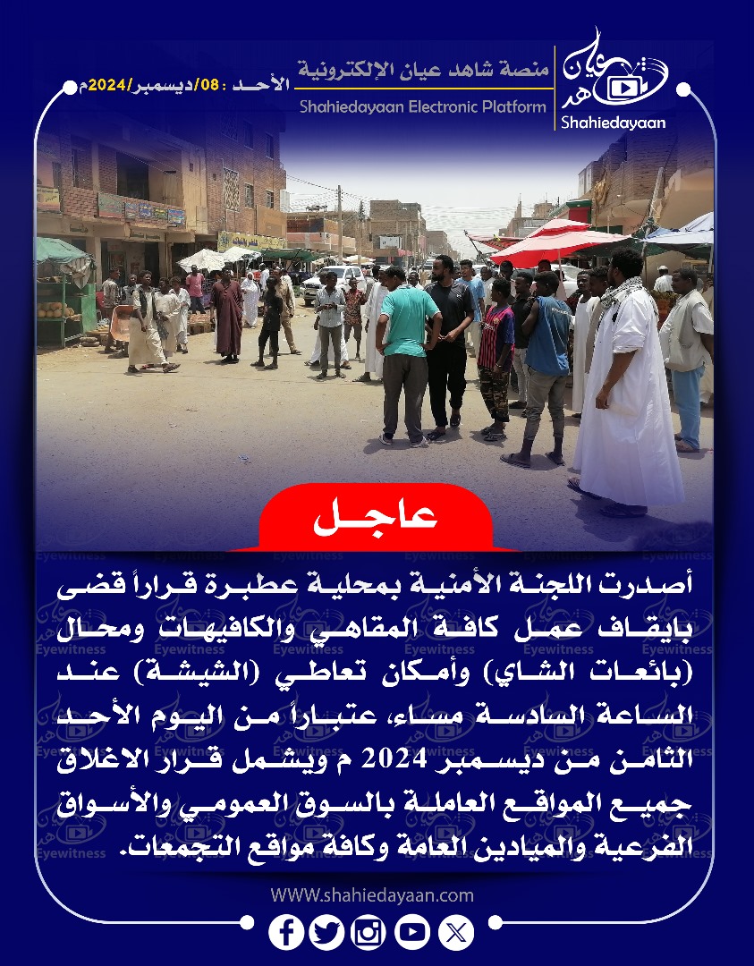 الأخبار خبر في صورة عاجل…. أصدرت اللجنة الأمنية بمحلية عطبرة قراراً قضى بايقاف عمل كافة المقاهي والكافيهات وبائعات الشاي وأمكان تعاطي (الشيشة) محال شاهد عيان ديسمبر 8, 2024 0 أقرأ المزيد ..