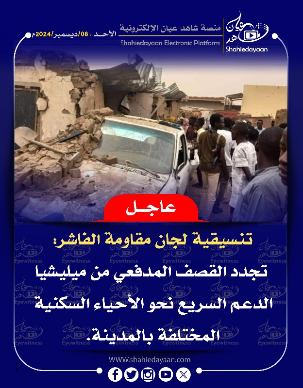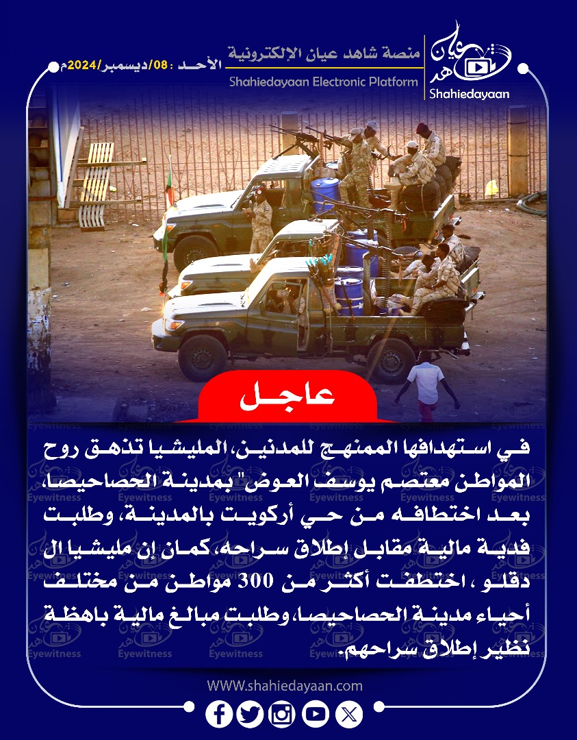 الأخبار خبر في صورة عاجل…..في استهدافها الممنهج للمدنين، المليشيا تذهق روح المواطن معتصم يوسف العوض” بمدينة الحصاحيصا شاهد عيان ديسمبر 8, 2024 0 أقرأ المزيد ..