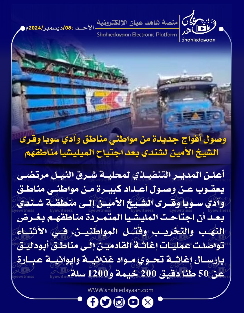 الأخبار خبر في صورة وصول أفواج جديدة من مواطني مناطق وادي سوبا وقرى الشيخ الأمين لشندي بعد اجتياح الميليشيا مناطقهم شاهد عيان ديسمبر 8, 2024 0 أقرأ المزيد ..