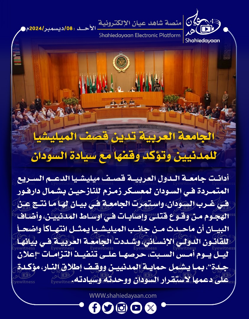 الأخبار خبر في صورة الجامعة العربية تدين قصف الميليشيا للمدنيين وتؤكد وقفها مع سيادة السودان شاهد عيان ديسمبر 8, 2024 0 أقرأ المزيد ..