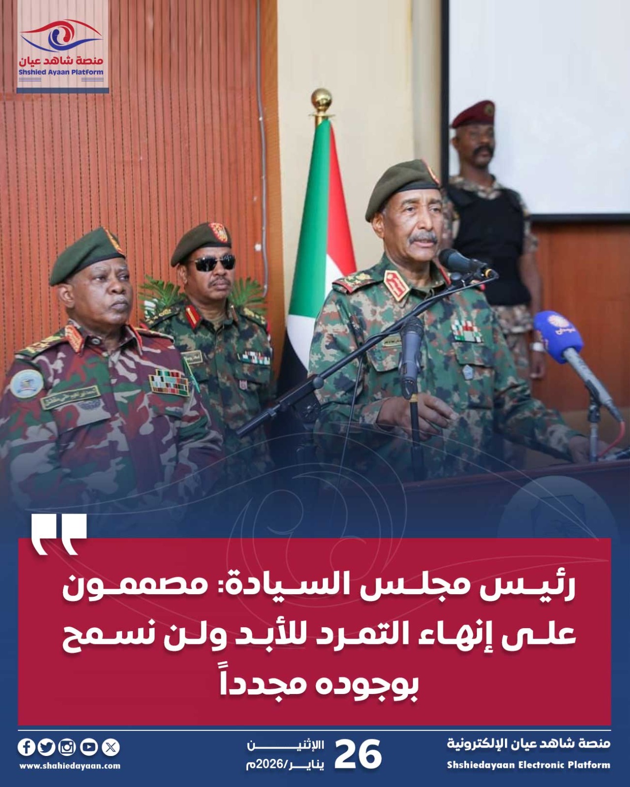 رئيس مجلس السيادة: مصممون على إنهاء التمرد للأبد ولن نسمح بوجوده مجدداً بورتسودان ٢٦-١-٢٠٢٦م أكد السيد رئيس مجلس السيادة القائد…