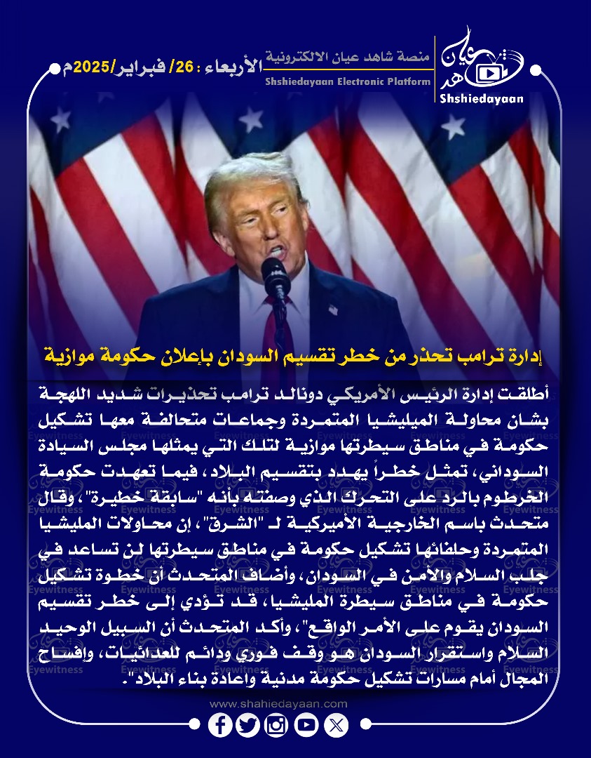 خبر في صورة الأخبار إدارة ترامب تحذر من خطر تقسيم السودان بإعلان حكومة موازية شاهد عيان فبراير 26, 2025 0 أقرأ المزيد ..