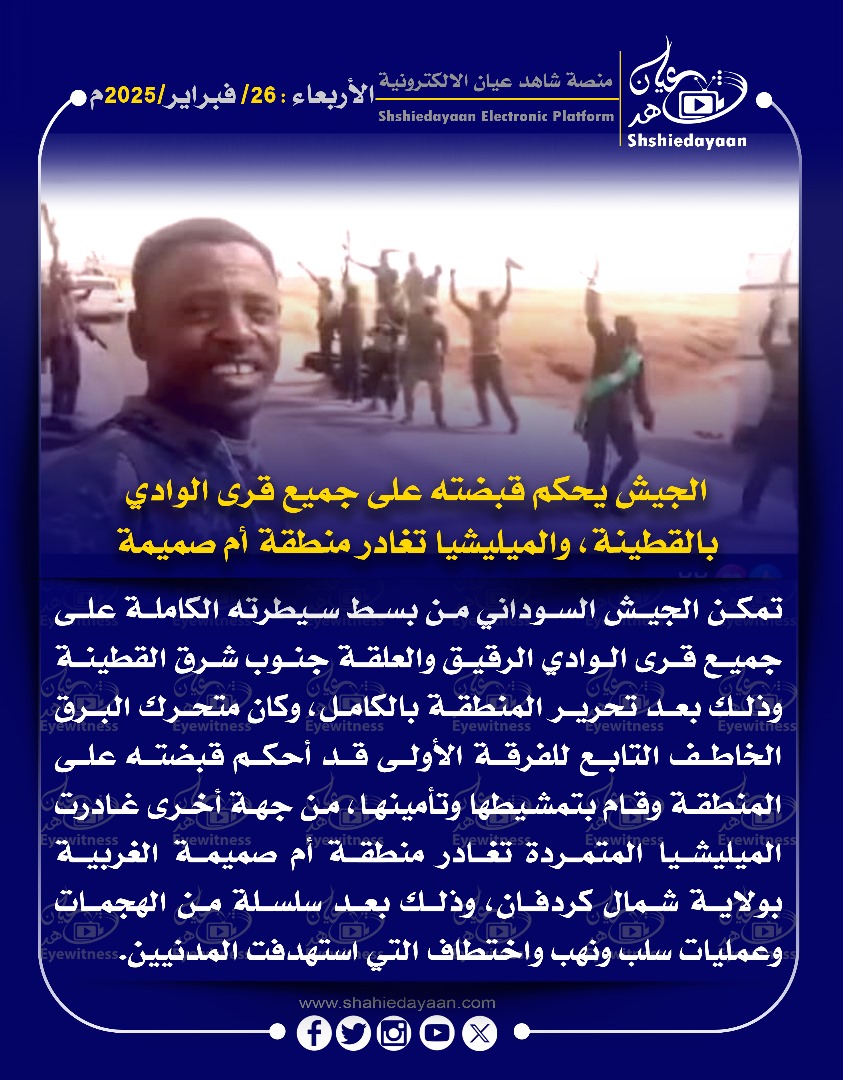 خبر في صورة الأخبار الجيش يحكم قبضته على جميع قرى الوادي بالقطينة، والميليشيا تغادر منطقة أم صميمة شاهد عيان فبراير 26, 2025 0 أقرأ المزيد ..