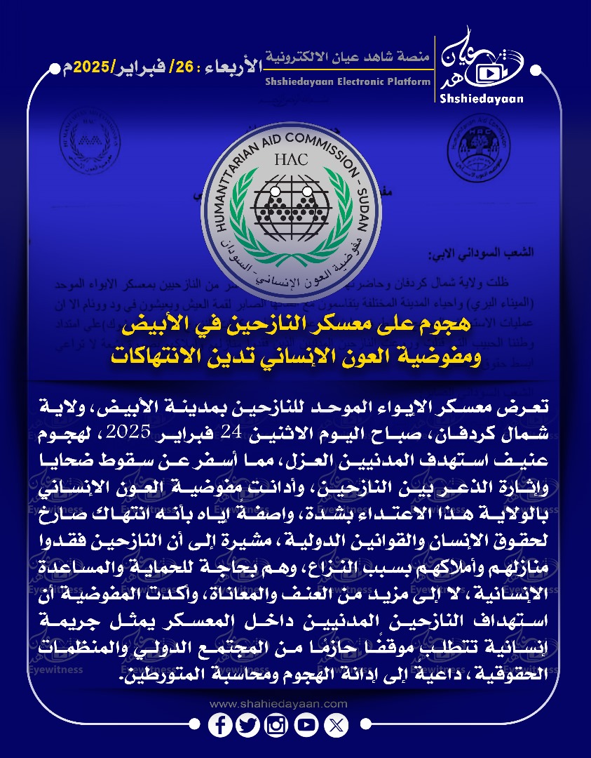 خبر في صورة الأخبار اللهجوم على معسكر النازحين في الأبيض ومفوضية العون الإنساني تدين الانتهاكات شاهد عيان فبراير 26, 2025 0 أقرأ المزيد ..