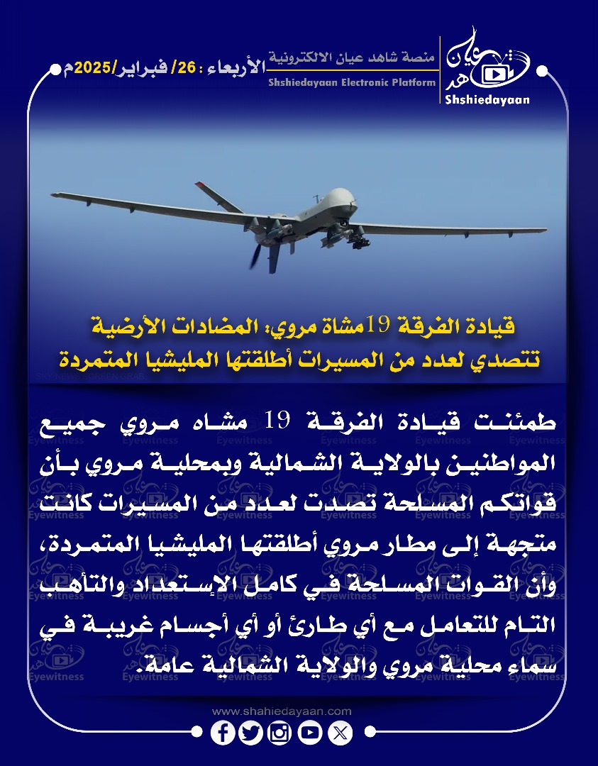 خبر في صورة الأخبار قيادة الفرقة 19 مشاة مروي: المضادات الأرضية تتصدي لعدد من المسيرات أطلقتها المليشيا المتمردة شاهد عيان فبراير 26, 2025 0 أقرأ المزيد ..