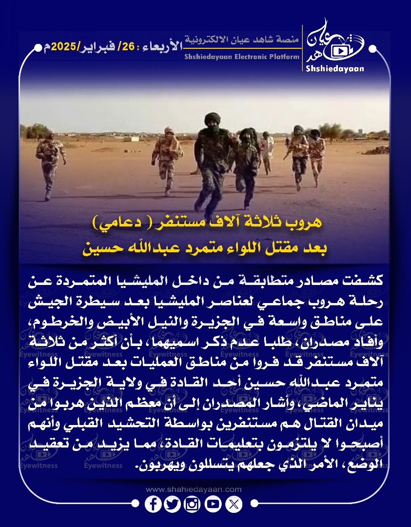 خبر في صورة الأخبار هروب ثلاثة آلاف مستنفر ( دعامي) بعد مقتل اللواء متمرد عبد الله حسين شاهد عيان فبراير 26, 2025 0 أقرأ المزيد ..
