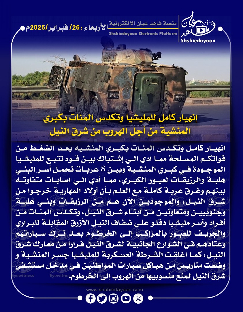 خبر في صورة الأخبار إنهيار كامل للمليشيا وتكدس المئات بكبري المنشية من أجل الهروب من شرق النيل شاهد عيان فبراير 26, 2025 0 أقرأ المزيد ..