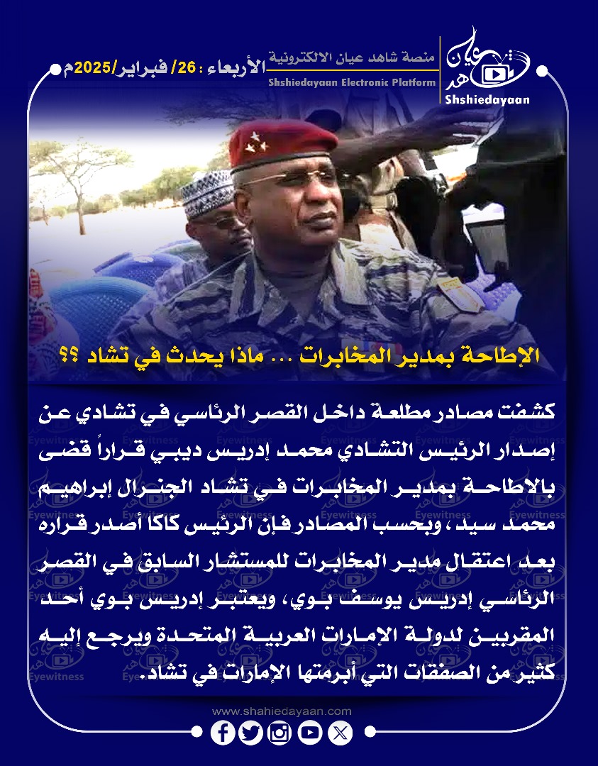 خبر في صورة الأخبار الإطاحة بمدير المخابرات … ماذا يحدث في تشاد ؟؟ شاهد عيان فبراير 26, 2025 0 أقرأ المزيد ..