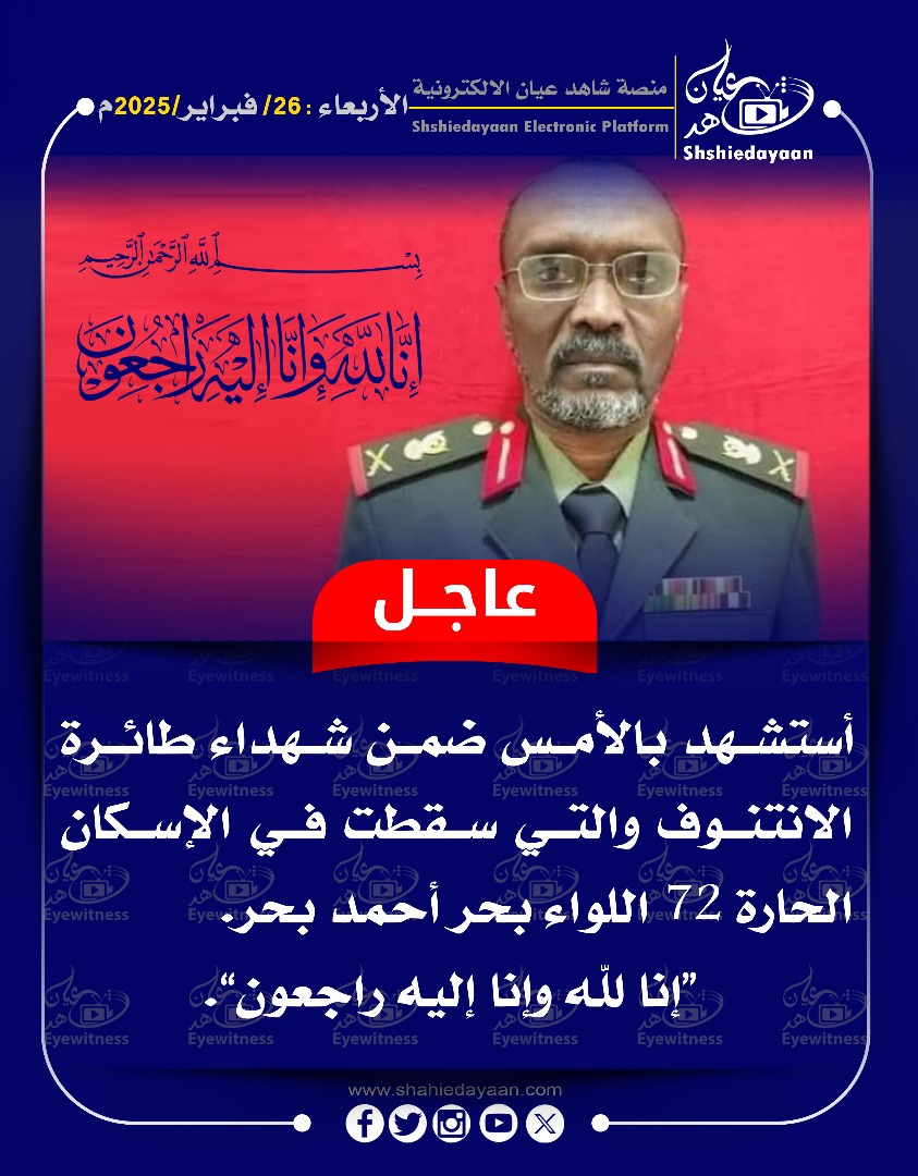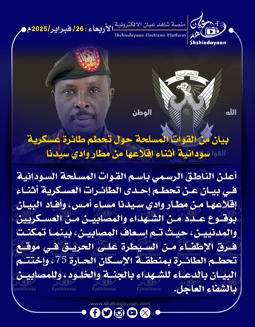 خبر في صورة الأخبار بيان من القوات المسلحة حول تحطم طائرة عسكرية القوا سودانية أثناء إقلاعها من مطار وادي سيدنا شاهد عيان فبراير 26, 2025 0 أقرأ المزيد ..
