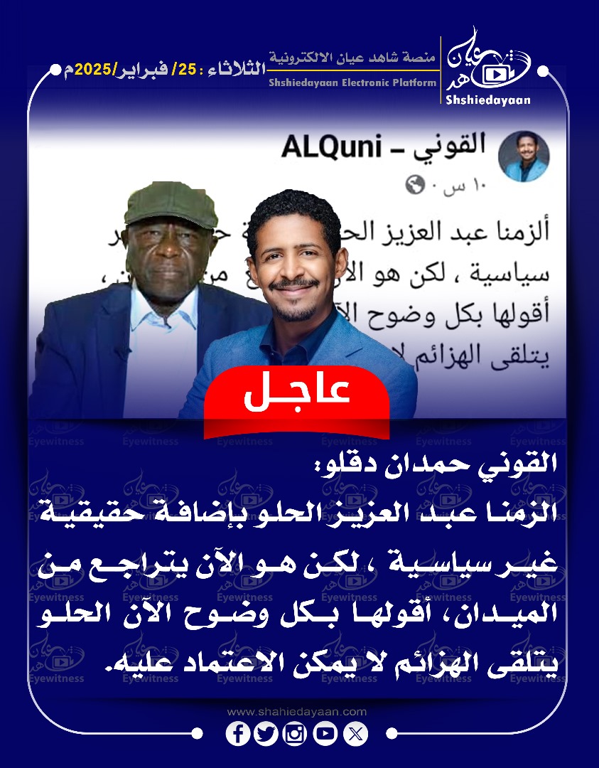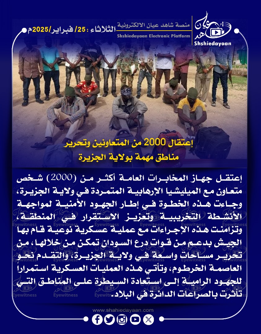 خبر في صورة إعتقال 2000 من المتعاونين وتحرير مناطق مهمة بولاية الجزيرة شاهد عيان فبراير 25, 2025 0 أقرأ المزيد ..