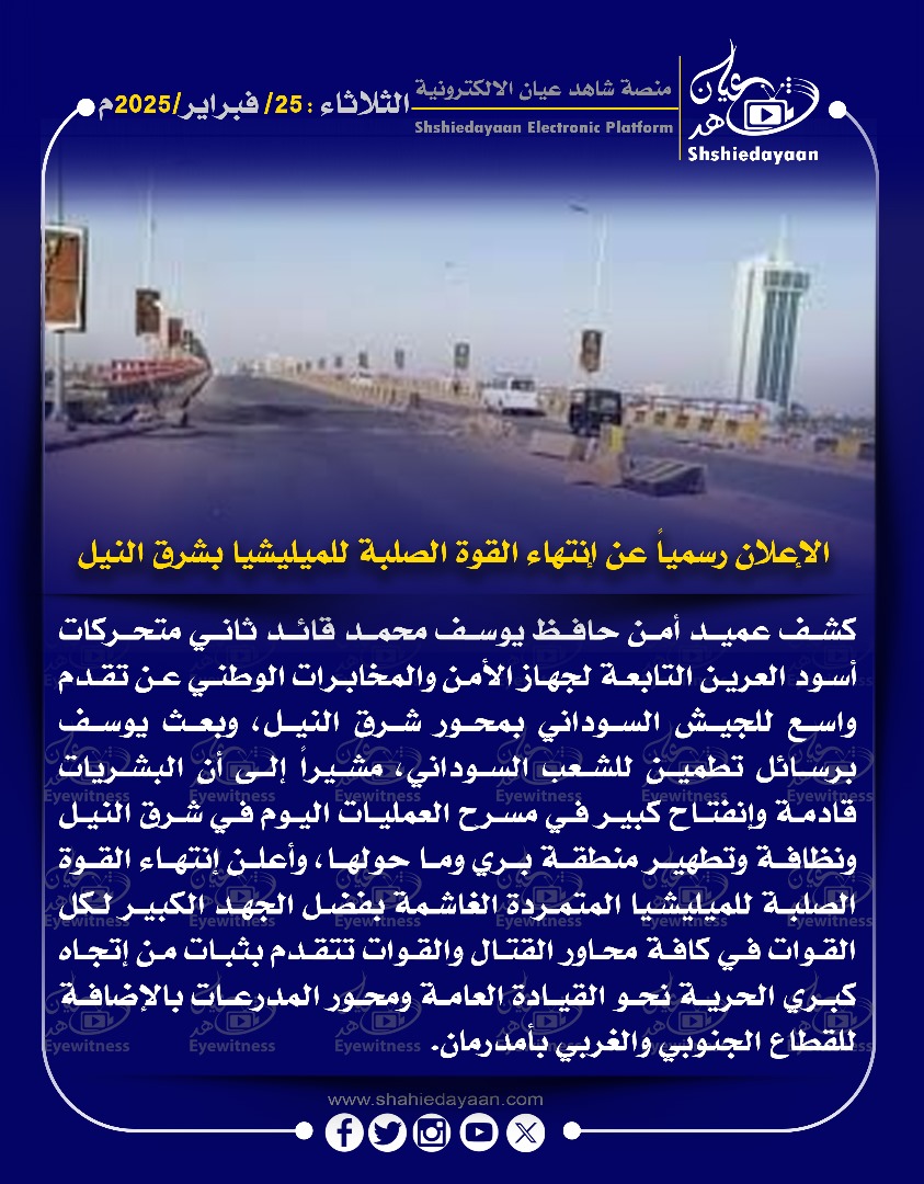 خبر في صورة الإعلان رسميا عن انتهاء القوة الصلبة للميليشيا بشرق النيل شاهد عيان فبراير 25, 2025 0 أقرأ المزيد ..