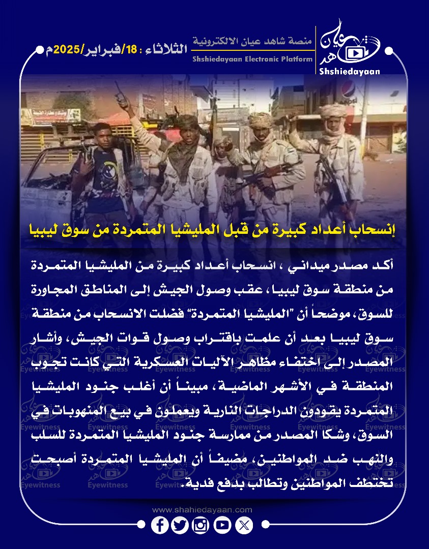 خبر في صورة إنسحاب أعداد كبيرة من قبل المليشيا المتمردة من سوق ليبيا شاهد عيان فبراير 18, 2025 0 أقرأ المزيد ..