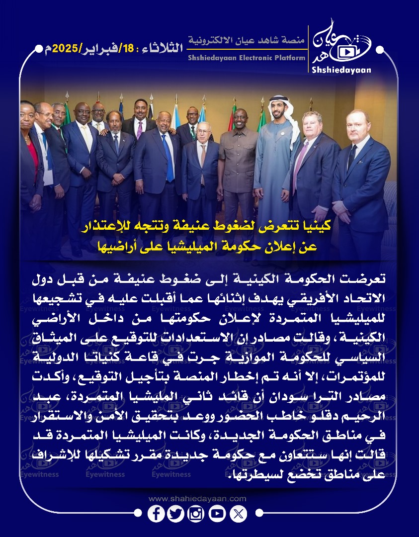 خبر في صورة كينيا تتعرض لضغوط عنيفة وتتجه للإعتذار عن إعلان حكومة الميليشيا على أراضيها شاهد عيان فبراير 18, 2025 0 أقرأ المزيد ..