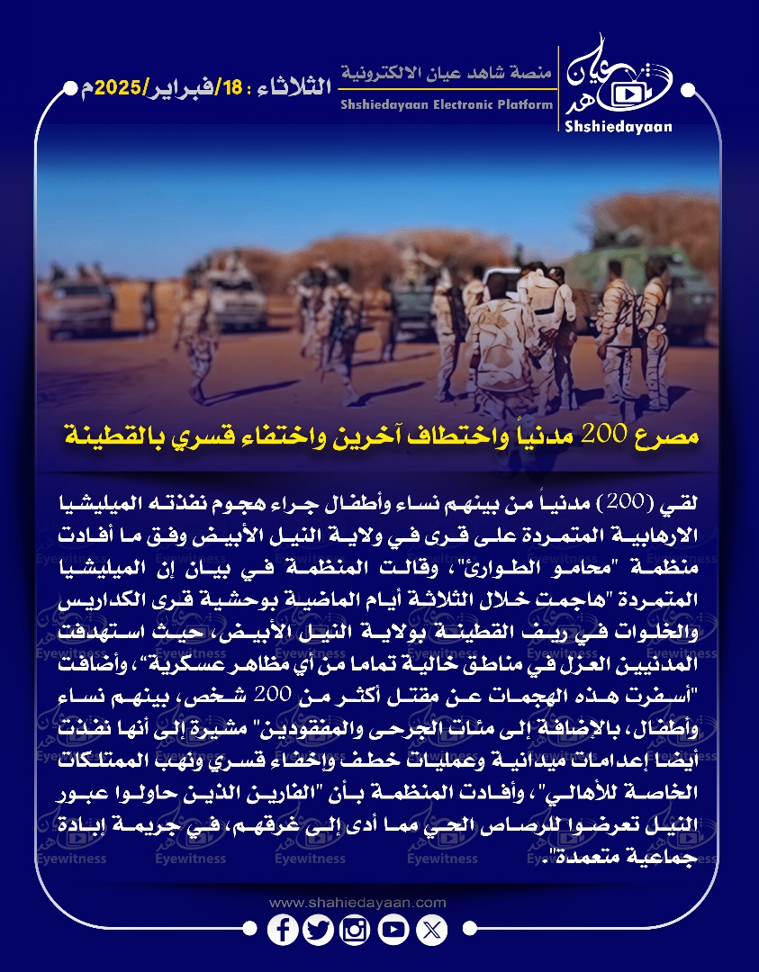 خبر في صورة مصرع 200 مدنيا واختطاف آخرين واختفاء قسري بالقطينة شاهد عيان فبراير 18, 2025 0 أقرأ المزيد ..