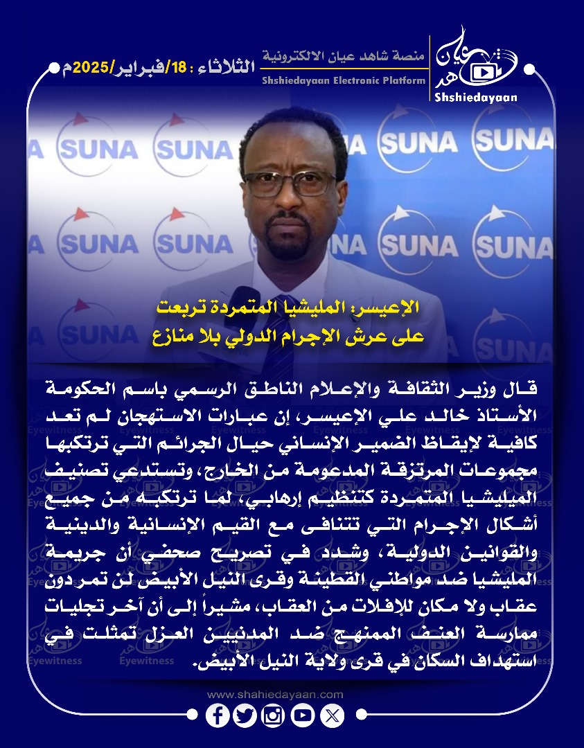 خبر في صورة الإعيسر: المليشيا المتمردة تربعت على عرش الإجرام الدولي بلا منازع شاهد عيان فبراير 18, 2025 0 أقرأ المزيد ..