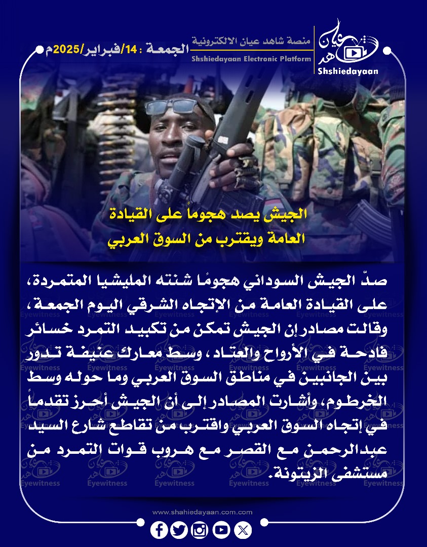 خبر في صورة الأخبار الجيش يصد هجوما على القيادة العامة ويقترب من السوق العربي شاهد عيان فبراير 14, 2025 0 أقرأ المزيد ..