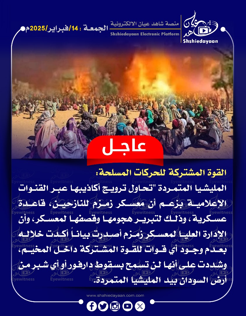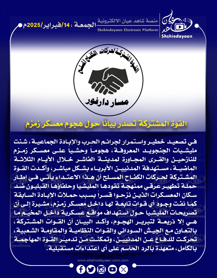 خبر في صورة الأخبار القوة المشتركة تصدر بيانا حول هجوم معسكر زمزم شاهد عيان فبراير 14, 2025 0 أقرأ المزيد ..