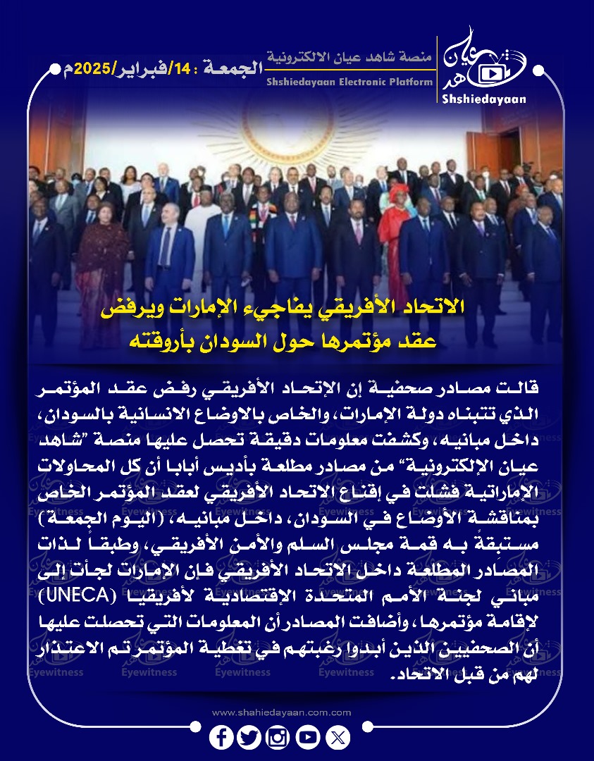 خبر في صورة الأخبار الاتحاد الأفريقي يفاجيء الإمارات ويرفض عقد مؤتمرها حول السودان بأروقته شاهد عيان فبراير 14, 2025 0 أقرأ المزيد ..