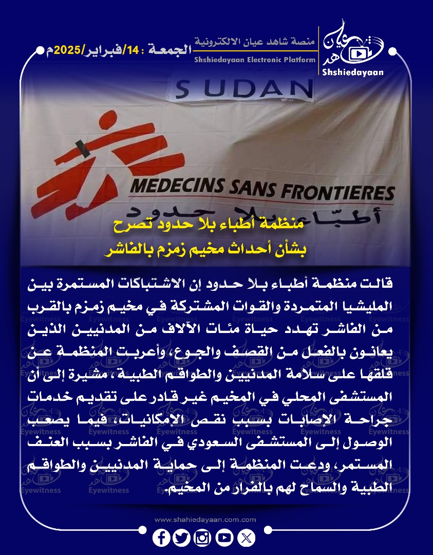 خبر في صورة الأخبار منظمة أطباء بلا حدود تصرحبشأن أحداث مخيم زمزم بالفاشر شاهد عيان فبراير 14, 2025 0 أقرأ المزيد ..
